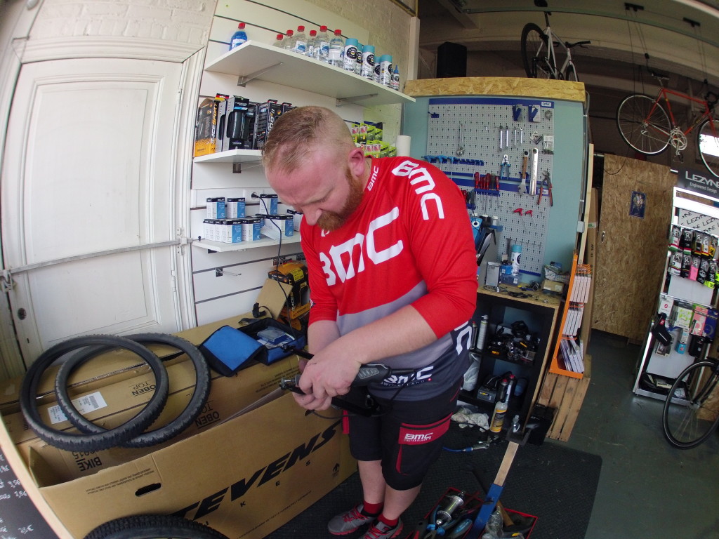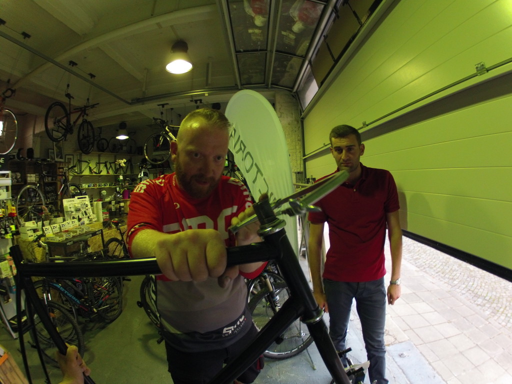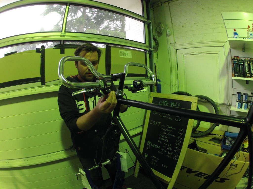 Luego, instalamos el manillar, los frenos y los cambios pero… aún tuvimos un problema : las horquillas estaban demasiado largas