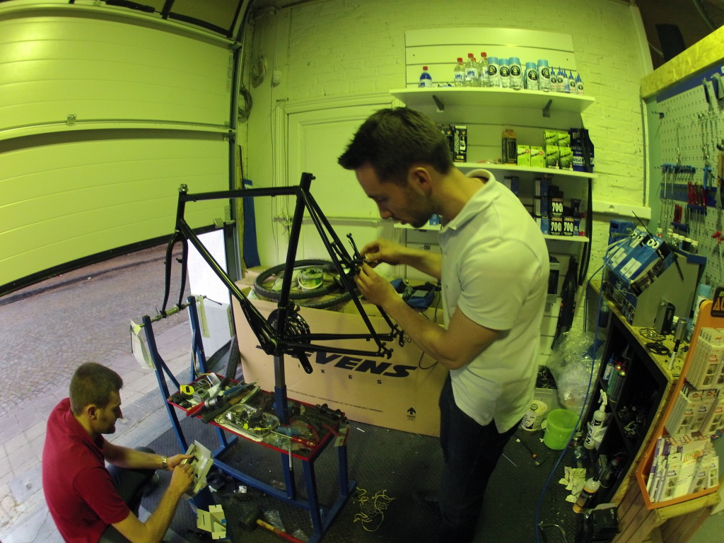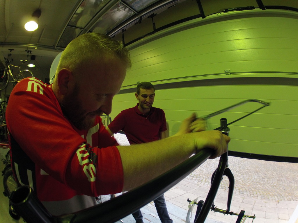 Laurent y Julien instalando los frenos V-BRAKES